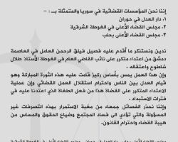 أصدرت هيئة تحرير الشام اليوم بياناً اتهمت فيه حركة أحرار الشام بـ "عرقلة الجهود نحو التوحد، وإفشال الاندماج واختلاق الأعذار الواهية التي تفضي إلى إعادة الأمور إلى نقطة الصفر". كما اتهمت الهيئة "أحرار الشام" ببث الشائعات والأكاذيب وكيل التهم ضد مشروع "هيئة تحرير الشام"، بالإضافة إلى تحريض جنودها على قتال الهيئة وتنصيب وتقديم الشخصيات المتهورة ضمن المناصب السياسية، مضيفة أنها تقوم بذلك تجهيزاً ليوم "تورط فيه جنودها في قتال المجاهدين". ودعت الهيئة حركة أحرار الشام إلى التوحد ضمن مشروع سني واضح موحد، محذرة إياها من إضاعة جهادها بيد من أسمتهم "مغامري السياسة وفتاوى التحريض من الخارج"، كما دعتها إلى تشكيل لجنة من الطرفين، تتسم بالحكمة والعقل، ويتم تفويضها وتخويلها لحل كافة الإشكالات والقضايا العالقة بخصوص انضمام ألوية وكتائب من الحركة لهيئة تحرير الشام. يشار إلى أن اشتباكات عنيفة دارت بين الطرفين، حيث هاجمت هيئة تحرير الشام عدة مقرات لحركة أحرار الشام، وسيطرت على أسلحة وذخائر.